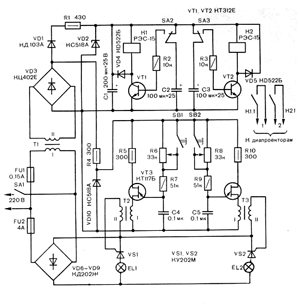 Для устойчивой работы тиристорных регуляторов обязательно должна быть предусмотрена синхронизация всех электрических процессов в схеме с частотой переменного сетевого напряжения. Поэтому схема управления питается пульсирующим трапецеидальным напряжением, которое формируется стабилитроном VD10. В начале каждого полупериода, когда амплитуда сетевого и питающего трапециедального напряжения равна нулю, происходит одновременное запирание тиристоров и однопереходных транзисторов, и схема возвращается в исходное состояние. Процесс отпирания этих элементов происходит тогда, когда управляющее напряжение на конденсаторах С4, С5 вновь достигнет заданного порогового уровня.