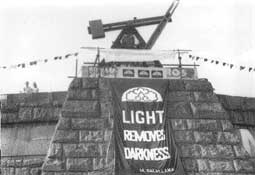 Следующее мероприятие, состоявшееся в июле-августе 1992 года, называлось "Фестиваль света". И, понятно, коллектив "светомузыкального" СКБ "Прометей", которым руководит автор, не мог не среагировать на приглашение в Прагу. Но когда мы подъезжали к катакомбам и увидели над входом лозунг "посвящается году Тибета", сразу стало ясно, что в катакомбах будет темно. Стало ясно, что основной расчет здесь, наверняка, на "внутренний свет", на "свет души". Хотя, если вернуться к презренной реальности, матерьяльности, свет, конечно, здесь был. Но, самыми мощными были источники света в ... одну свечу. Стеариновую свечу. Правда, их было много. Они были натыканы повсюду: на пирамидах из оцинкованных ведер, в глазницах черепов, в ямках с дождевой водой, которая капала сверху. Да и сама выставка открылась торжественным шествием, со свечами в руках - тибетский лама в юбке, в сопровождении пестрой толпы юных хиппи, кришнаитов, панков и чинных представителей советского авангарда. Пыльный цемент, "кап-кап", цепочки мерцающих огней. Медитация и экзальтация, экзотика и мистика. Весь дежурный набор современного "арт-джентельмена". Лишь бы не споткнуться и не упасть в канаву... Одинокие зрители блуждали в темноте среди бетонных столбов, боясь наступить на произведения искусства - разбросанные там и сям "инсталляции", созданные тут же на месте из подручного материала. В основном это были круги, спирали и надолбы из камней, напоминающие магические, ритуальные строения, которые обнаруживают порою археологи (например, в Англии - Stonehenge, или в России - на Соловецких островах). В некоторых инсталляциях использовалась современная техника, но тоже не ярче свечи. Чех Tomas Ruller установил в начале длиннющей бетонной канавы маленький лазер, и медитирующие зрители долго шли вдоль слабенького, чуть заметного красного луча, чтобы обнаружить вдруг (конец медитации!), как он, луч, упирался в никелированную лопату, воткнутую в кучу гравия. Просто и со вкусом. Американец Steve Wainstock разбрызгивал луч такого же пятимилливаттного лазера фирмы "Tesla" от зеркал вращающейся кинетической конструкции. Им же были представлены "радужные" голограммы - с нашей, советской точки зрения они были самым ярким экспонатом выставки.