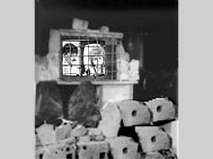 Экспозиция СКБ "Прометей" была спокойнее. Светомуэыкальные фильмы и штук десять видеоинсталляций. Это и "Электронный бэби", ставший популярным уже не на одном континенте (рис.2) и "Электронный корт", видеокомпозиция "От тюрьмы и сумы не зарекайся", которой мы встречали зрителей у входа в катакомбы (рис.3) (впрочем, см. об этих наших работах в статьях [5 и 6]). Расскажу подробнее о нашей новой видеоинсталляции, специально подготовленной для пражского фестиваля (рис.4).