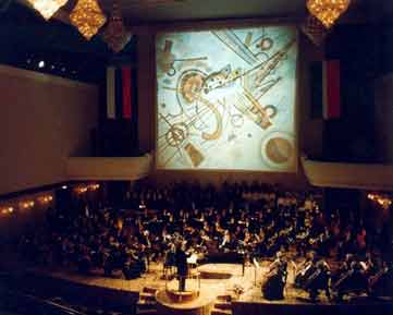 На более радикальный эксперимент решились мы, когда нам предложили участвовать в юбилейном концерте, посвященном 50-летию Казанской консерватории и проводимом в только что построенном, новом зале (21 июня 1996 г.) В его программу был включен "Прометей" (дир. - Ф.Мансуров, партия ф-но - Е.Михайлов). А из светотехнических средств в зале имелись лишь два мощных слайд-проектора "Pani ВР-4, Compact" (рис.6), работающих в режиме "наплыв" с большим экраном (9х9 м). Они были предназначены нами для продолжения просветительских концертов "Музыка, поэзия, живопись", которые мы проводили с консерваторией в прошлые годы, в старом зале, с маломощными проекторами "Протон". Другой светотехники в новом зале не было, если не считать люстр. Поэтому мы поначалу отказались, но затем вспомнили вдруг собственные выступления на конференциях по Кандинскому (Гаага, 1993; Москва, 1994), завершаемые нами патетически высокой риторикой: "Ах, как жаль, что Скрябин не был знаком с Кандинским, вместе они добились бы настоящего синтеза!.." Так почему бы не рискнуть нам сегодня устроить их "встречу" - тем более, что никто, наверно, не изучал столь подробно и глубоко синтетические замыслы Скрябина и Кандинского в их параллельном сопоставлении?..