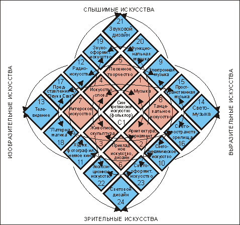 Напомним о структуре и содержании нашей "периодической системы" (см.рис. 2) "Латерна магика" (18) в этой схеме находится между "кинематографом" (11) и "телевидением" (13), и в то же время - рядом с "драматическим театром" (7), что, как мы видим, достаточно полно отражает его видовую специфику.