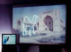 На большом экране плавно, под музыку "Болеро" Равеля, медленно шагает верблюд, нарисованный методом компьютерной графики, а внизу уже с экрана телевизора на него целый день лает пес. Вот и получается: "Собака лает, а караван идет".